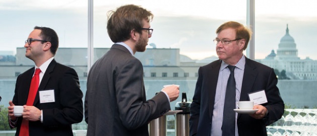 IDEA EXCHANGE, WASHINGTON, D.C. (L-R): Justin Meyers, BA’06; Brendan Foht, BA’08; and Bruce Leighton, BA’77, attend a breakfast at the Embassy of Canada, where Jack Mintz, President’s Fellow, School of Public Policy, led a lively discussion.